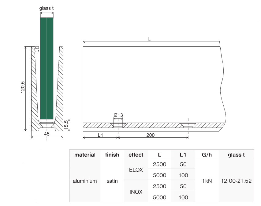 Profilé de montage pour verre de 12 à 21,52 mm, longueur 2,5 m, 1,0 kN, aluminium, ELOX