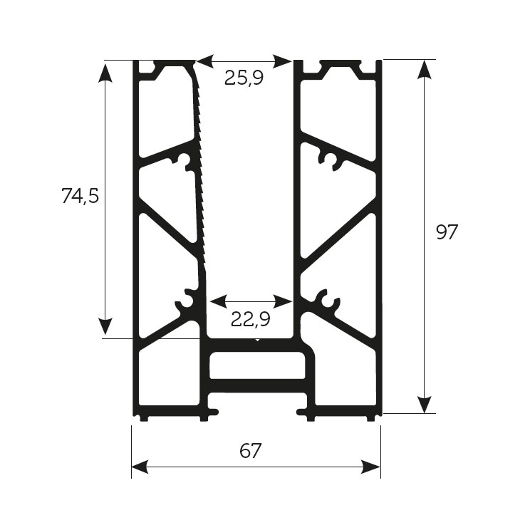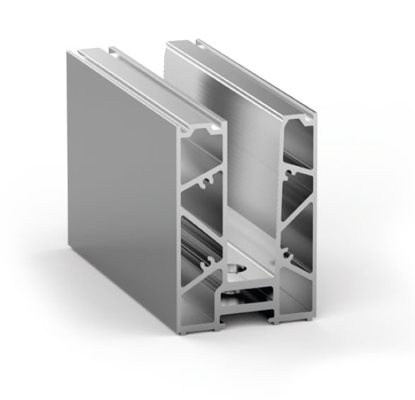 Élément du système de balustrade en verre ALUSMART A50 ECO. Le profilé est utilisé comme élément de départ/d’arrivée et dans la partie centrale de la balustrade.